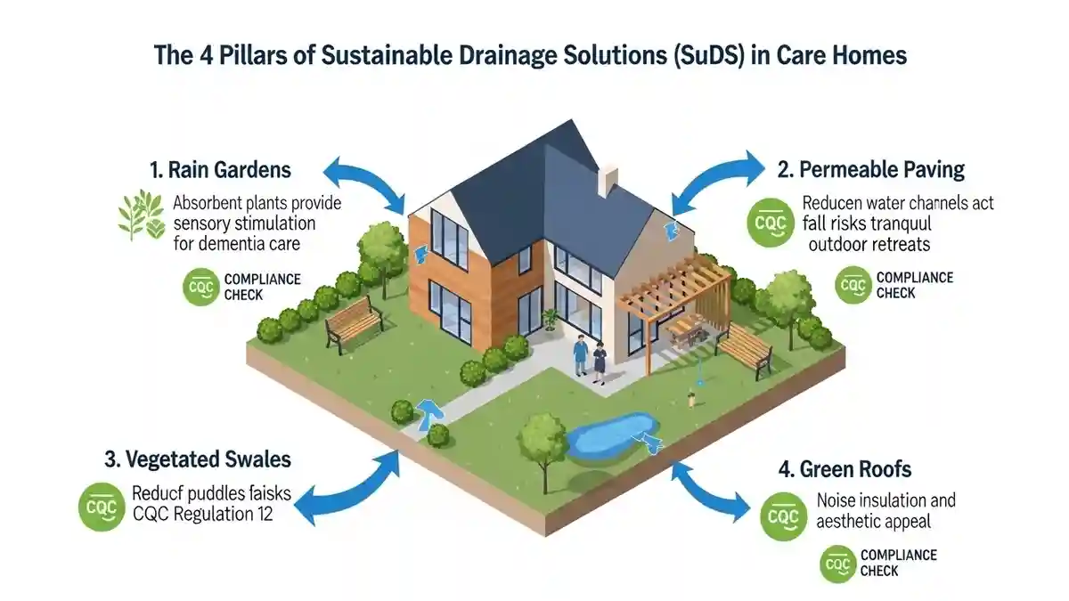 The future of sustainable drainage solutions CQC care home design is the integration of SuDS (Sustainable Drainage Systems). In Stanmore, Policy EN18 of the Local Plan encourages SuDS to manage surface water runoff, which often plagues the surrounding area.